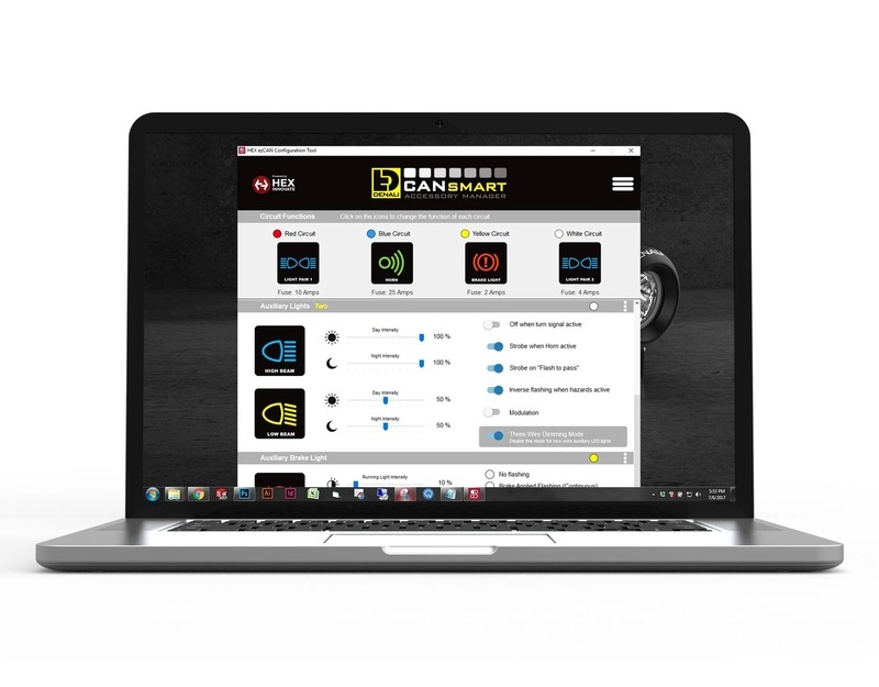 Τα τέσσερα κυκλώματα του CANsmart είναι προ-προγραμματισμένα για να συνδέουν και να ελέγχουν ανεξάρτητα δύο σετ φώτων DENALI 2.0, μια κόρνα SoundBomb και το βοηθητικό φως φρένων B6.